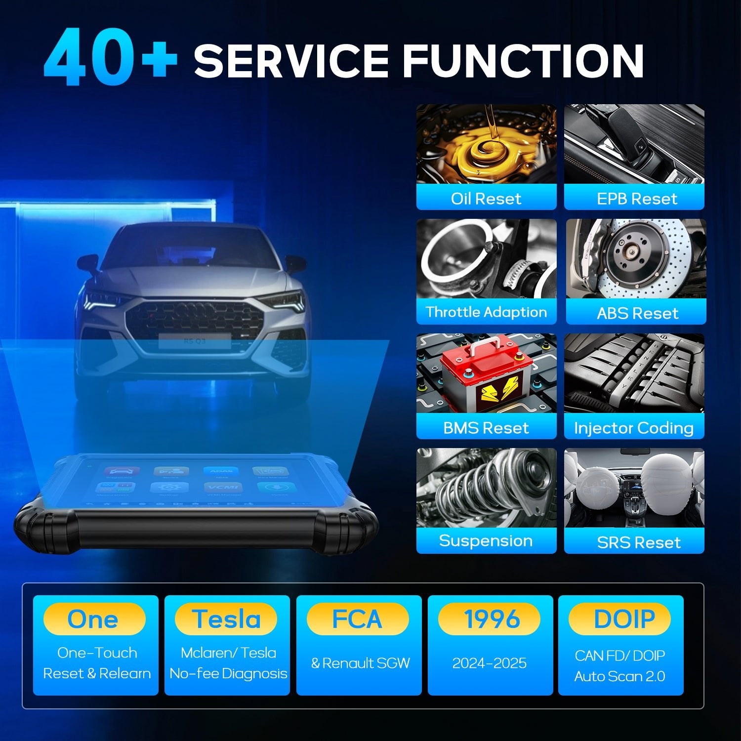 - SRS & Throttle Adaptation - Supports modern vehicle protocols including DOIP, CAN FD, and FCA AutoAuth, plus Tesla and McLaren access with no subscription fees.